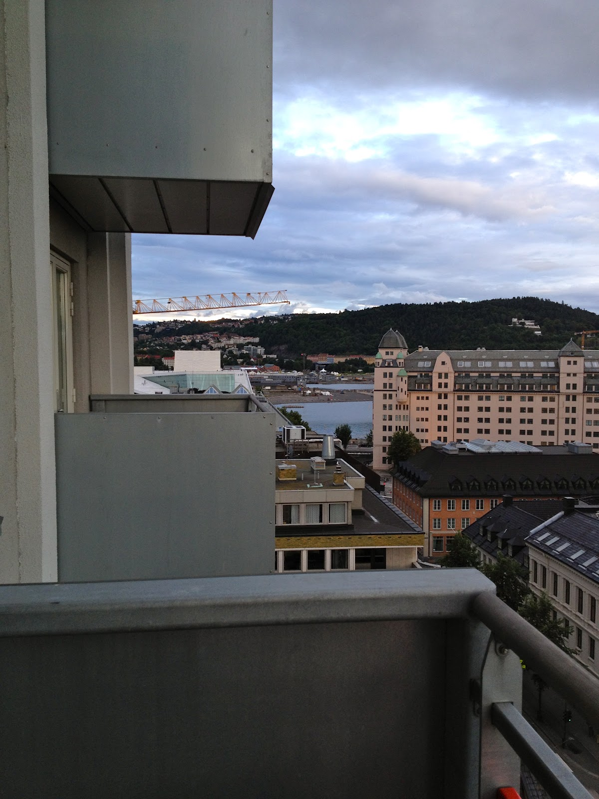 Balkong er jo luksus på hotell i Oslo, og herlig å nyte morgenteen her og sole seg og få luft. Greit med plass og begge dørene kunne åpnes. Ikke all verdens utsikt, men veldig luksus å ha egen balkong. Den ble flittig brukt.