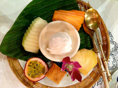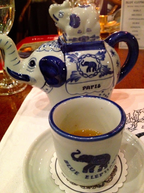 Du får en 11-retter inkludert dessert i Blue Elephant Paris sin kongemeny. Prisen for det hele er 400 kroner per person. Dette var i 2013, så dette vil variere etter valutakurs. I 2017 kostet den dyreste menyen 48 euro. Ikke billig, men så er det også mat av høy klasse og kvalitet du får servert. Og jeg kan love deg at du blir mett, nesten uansett hvor storspist du er. Ris er også med i pakken. De har også a la carte og en egen vegetarianer-meny. Det som kan gjøre kvelden ekstra kostbar, er om du heller nedpå av Singha-en. Den koster 7,50 euro for 0.33, Heinken koster 6 euro. Det kan jo gå noen flasker når du sitter i tre, fire timer. Men det gjør det vel nesten uansett hvor du ville vært den kvelden. Og det har litt med at det liksom passer best med øl til, selv om jeg godt vet at det finnes mye gode viner til thaimat. Selv gikk jeg ikke overraskende for te, sjasminte er et utmerket følge til thaimat.