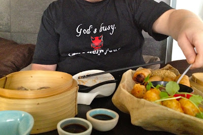 Kelneren var også kokken, så det tok bittelitt tid før han kom. Servicen var deretter upåklagelig. Imponert over kapasiteten til mannen. Jeg hadde trodd vi kunne få dim sum-menyen med forretter, hovedretter og dessert til 350 kroner også fra klokken 12. Men nei, den var bare fra 17 og utover. Det var mulig å få noen utvalgte dim sum samt en okserett til lunsj, men jeg ville ikke fylle magen med okse når jeg var ute etter småretter. Så det ble bestilt