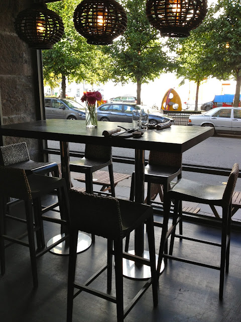 Det praktiske først. Det er ett stort 6-manns høydebord rett ved inngangen. Så følger en lang rekke med bord som kan lett slås sammen. Sitter du med ryggen til veggen her, ser du rett inn i det lille avlange kjøkkenet. Bak kjøkkenet er det to firemannsbord. Det var bare fire andre gjester, så vi satte oss i en ende lengst borte fra inngangen.