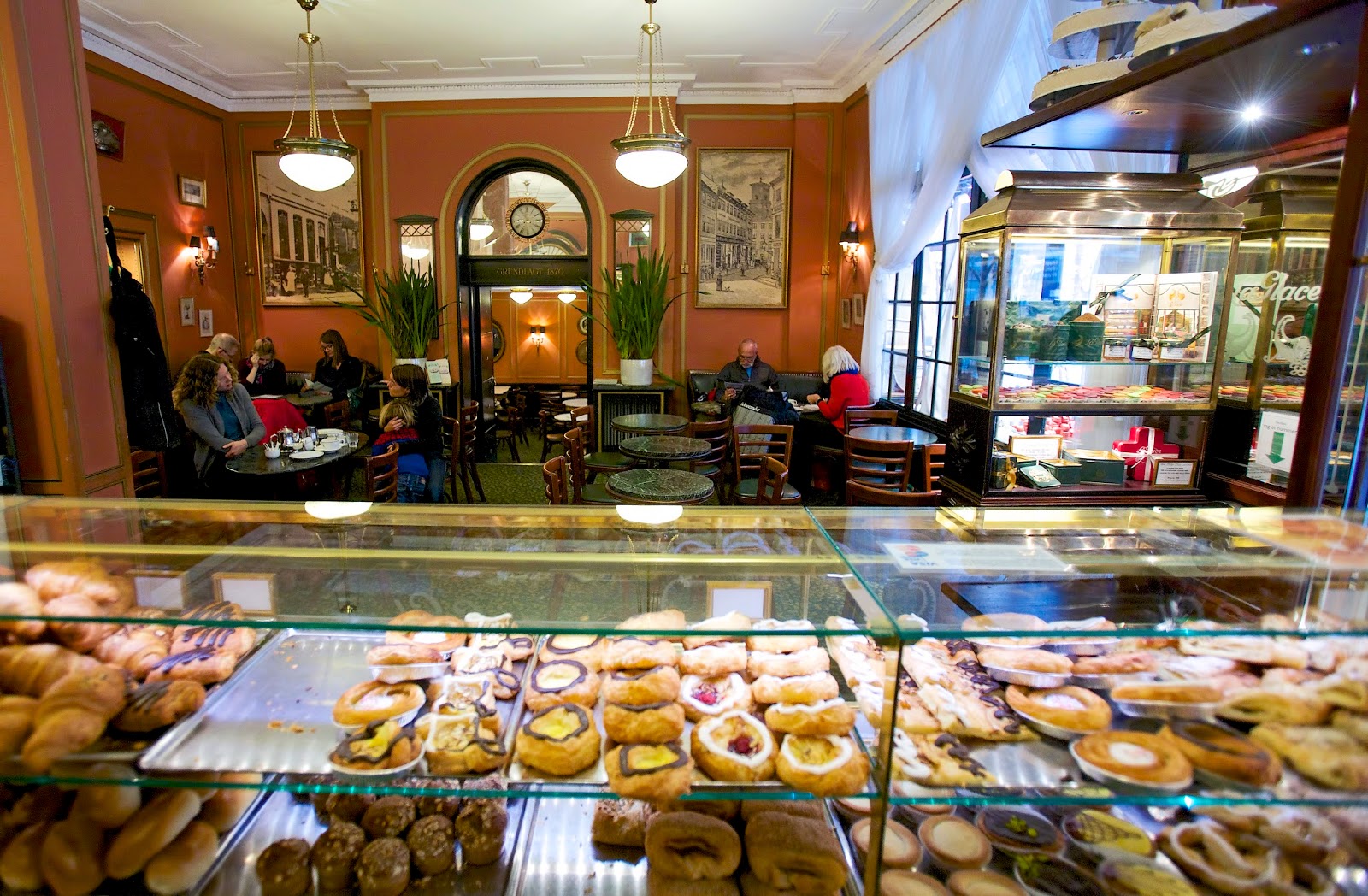 Det er jo heller ikke vanskelig å smile og bli i godt humør når en stiger inn i La Glace konditori i Skoubogade 3. Har du vært i Kongens by, har du garantert gått forbi det, om du ikke allerede har vært her og mesket deg. For den lille høye bygningen ligger i en sidegate til Strøget. Det er lett å bli stående måpende foran fristende utstillinger i vinduene. Sliter du deg løs og går inn glassdøra, får du straks hvilepuls. Bak disken står en smilende betjening i grønne forklær og hvite skjorter. Et lunt miljø og skinnsofaer innbyr til late timer. Her har københavnere kommet i generasjoner for å få akkurat sin favoritt. Som vannbakelsen Prinsesse Thyra med glasur av sjokolade, appelsin eller rom. Hun ble skapt i 1870, og troner fremdeles på mange tallerkener som bæres til bordene. For det bestilles ved disken, og så leveres godsakene på brett på La Glace konditori.