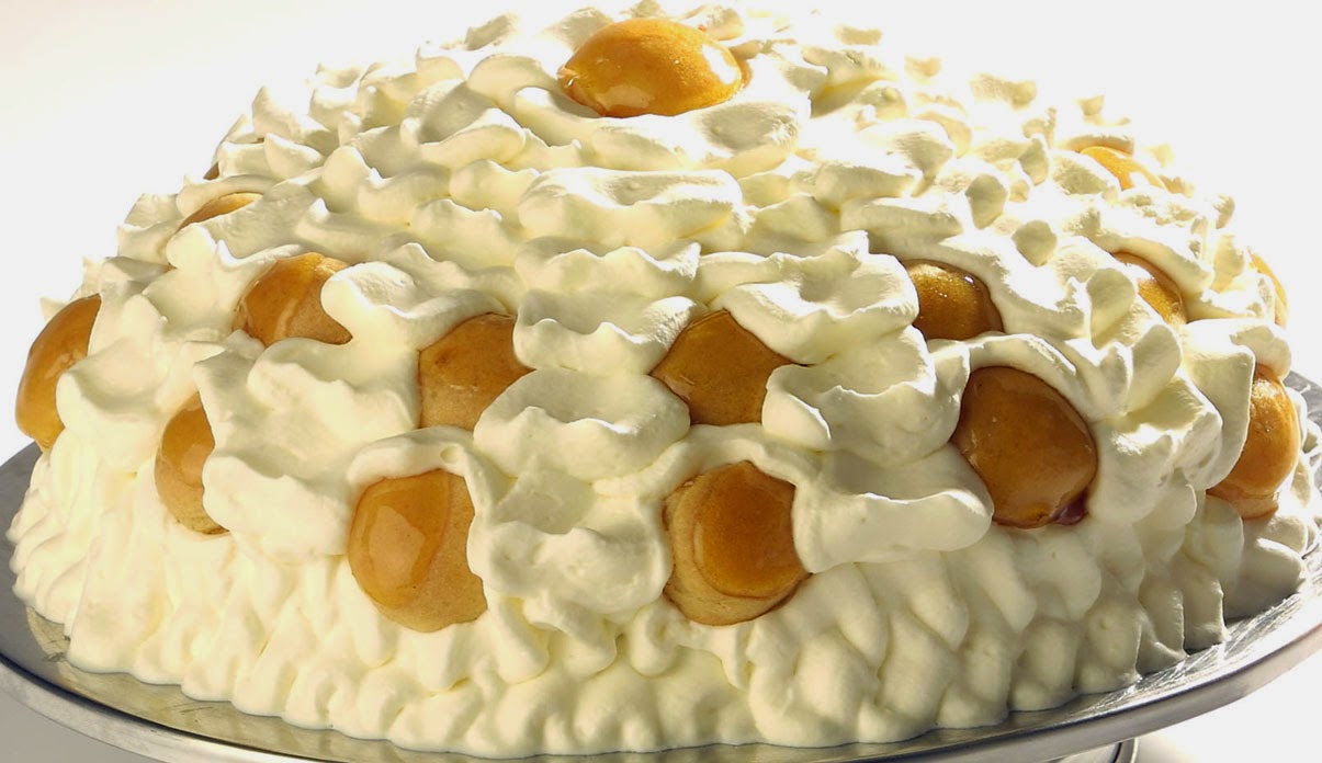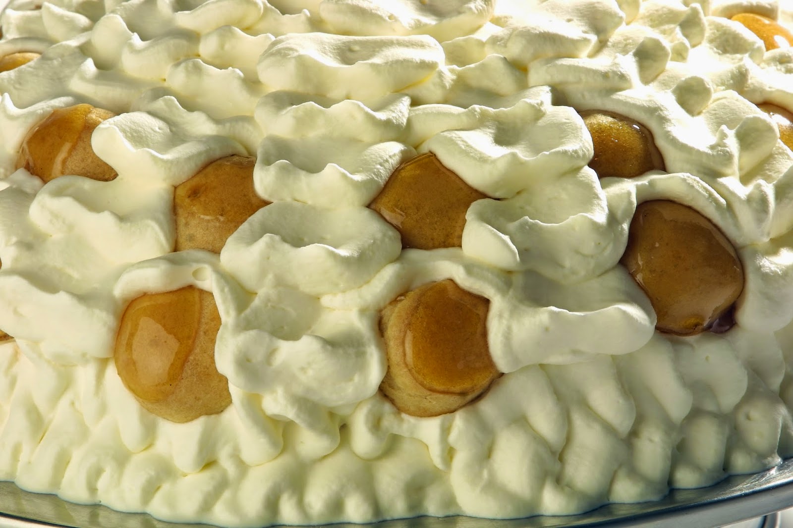 Legg makronbunnen på et kakefat. Form den piskede kremen med den knuste nougaten til en halv fotball (det er jo tross alt en sportskake). Sett de karamelliserte vannbakelsene parvis rundt om på kaken. Pynt til slutt med sprøytede kremblader.