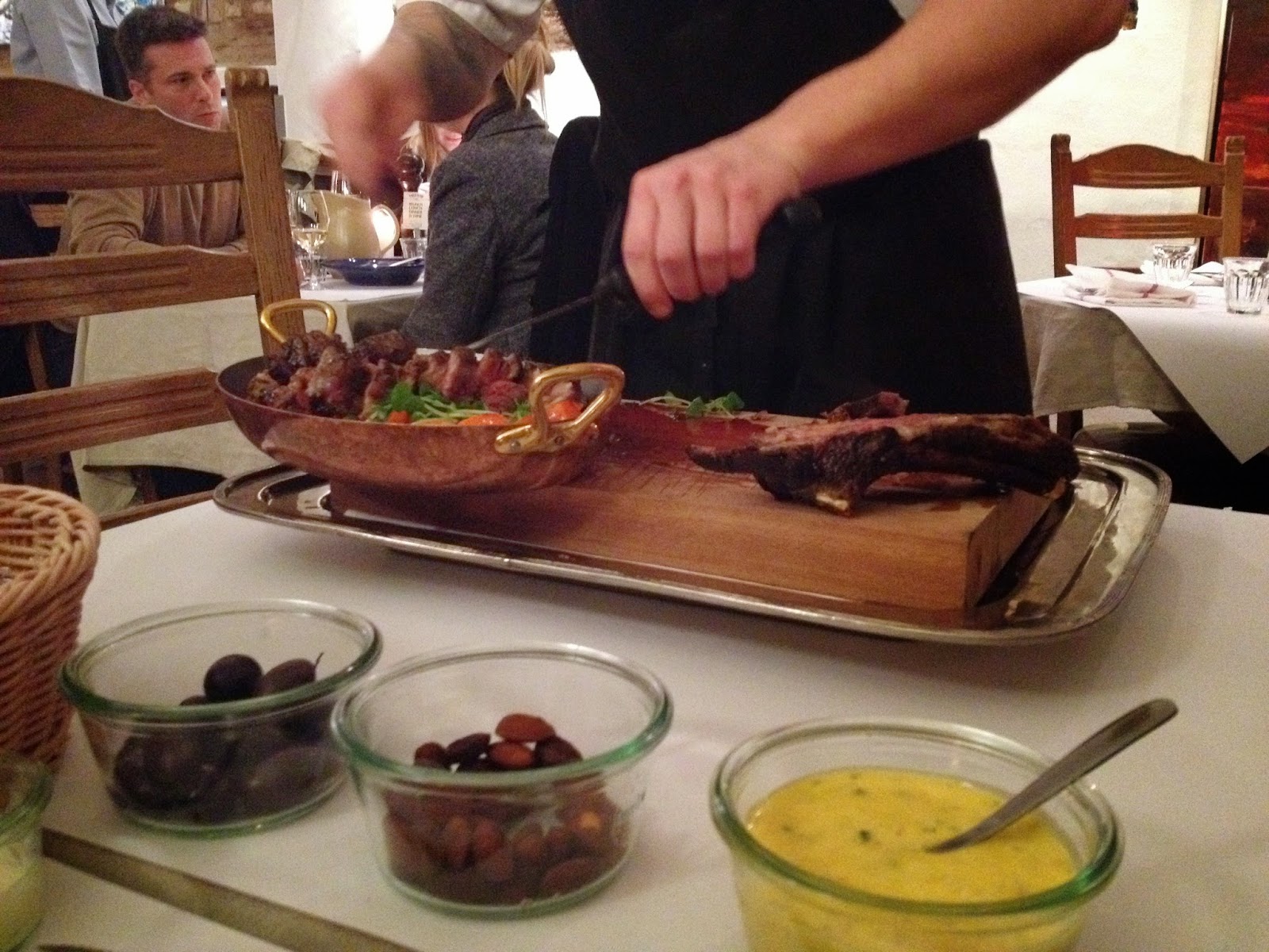 Lekkert presentert, mandler, oliven, saus, poteter og grønnsaker var delikate og supergode på smak. Kjøttet var jeg sånn passe fornøyd med, smaken var ikke helt suveren. Min medspiser var ennå hardere i sin dom: Disse kyrne har stått mye på bås. Jeg kan smake at de ikke har vært mye ute og spist frisk gress. Så da regningen kom, spurte jeg hvilken dansk gård det kom fra. Vi orket ikke si at kjøttet hadde vært sånn passe, det er noe med å gjøre seg selv og alle rundt i dårlig humør. Servitrisene trodde nok at vi likte det godt, kom tilbake fra kjøkkenet og sa at kjøttet ikke var dansk, men engelsk (!) og at de fantes i en butikk, hørtes ut som et supermarked, like i nærheten. Så kunnskapen hos den ansatte var enten feil, eller så var han kanskje flau over kvaliteten? Uansett. Alt annet var godt, og det var et veldig koselig sted med hyggelig betjening. På tirsdager har de hummermeny, så neste gang kommer jeg nok tilbake for sjømaten. Vår beste matopplevelse i det flotte Latinerkvarteret, kom på en fransk restaurant like i nærheten av Mefisto. Mer om det i et annet innlegg!
