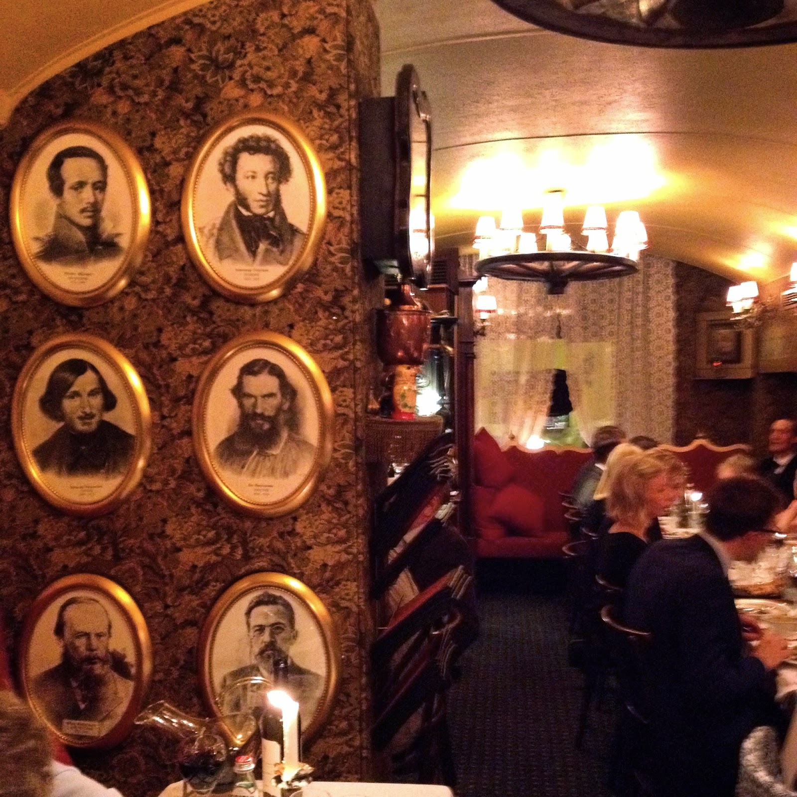 Menyen i rød fløyel er av en behagelig størrelse, likevel var det vanskelig å velge. Jeg hadde lyst på villsvin, men det var dessverre utsolgt. Jeg tok kylling Kiev, som jeg ikke hadde smakt før – angret bittelitt etterpå at jeg ikke valgte den russiske klassikeren Stroganoff, menmen.