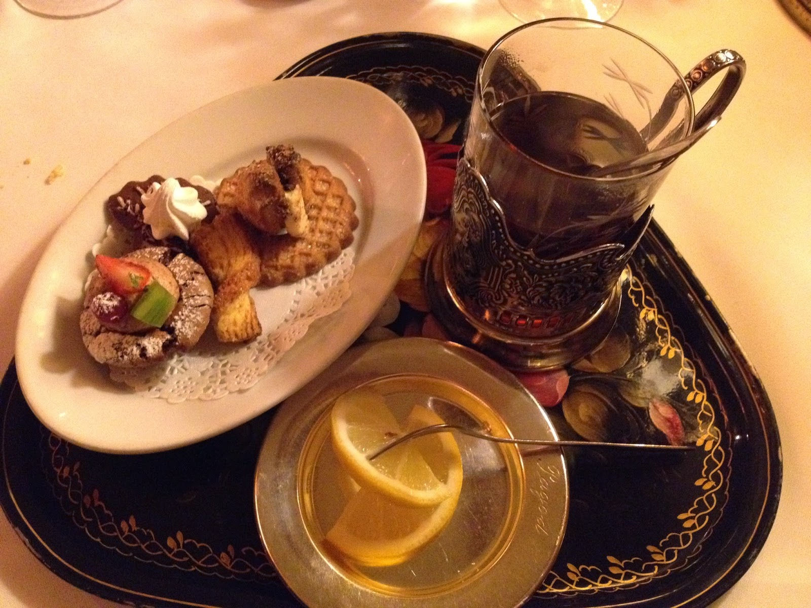 Oksen var ekstremt mør, og igjen store porsjoner. Haren likeså, med suveren vilsmak. Kyllingen var litt i kjedeligste laget, så jeg forsynte meg av haregryta. Til dessert ble det russisk te-brett, te med småkaker. Helt ok. Forrettene var helt i toppklasse, det meste av hovedrettene også. Hadde jeg klart mer, skulle jeg bestilt sjokoladekaken til dessert fremfor tekoppen – men jeg var altfor mett. Troikka er helt klart et besøk verdt. Gode drikkevarer har de også. Bordet gitt for russisk øl, samt en vin fra Georiga til 42 euro. Veldig god! Men de har vin også fra de tradisjonelle landene, for de som ikke våger seg utpå.