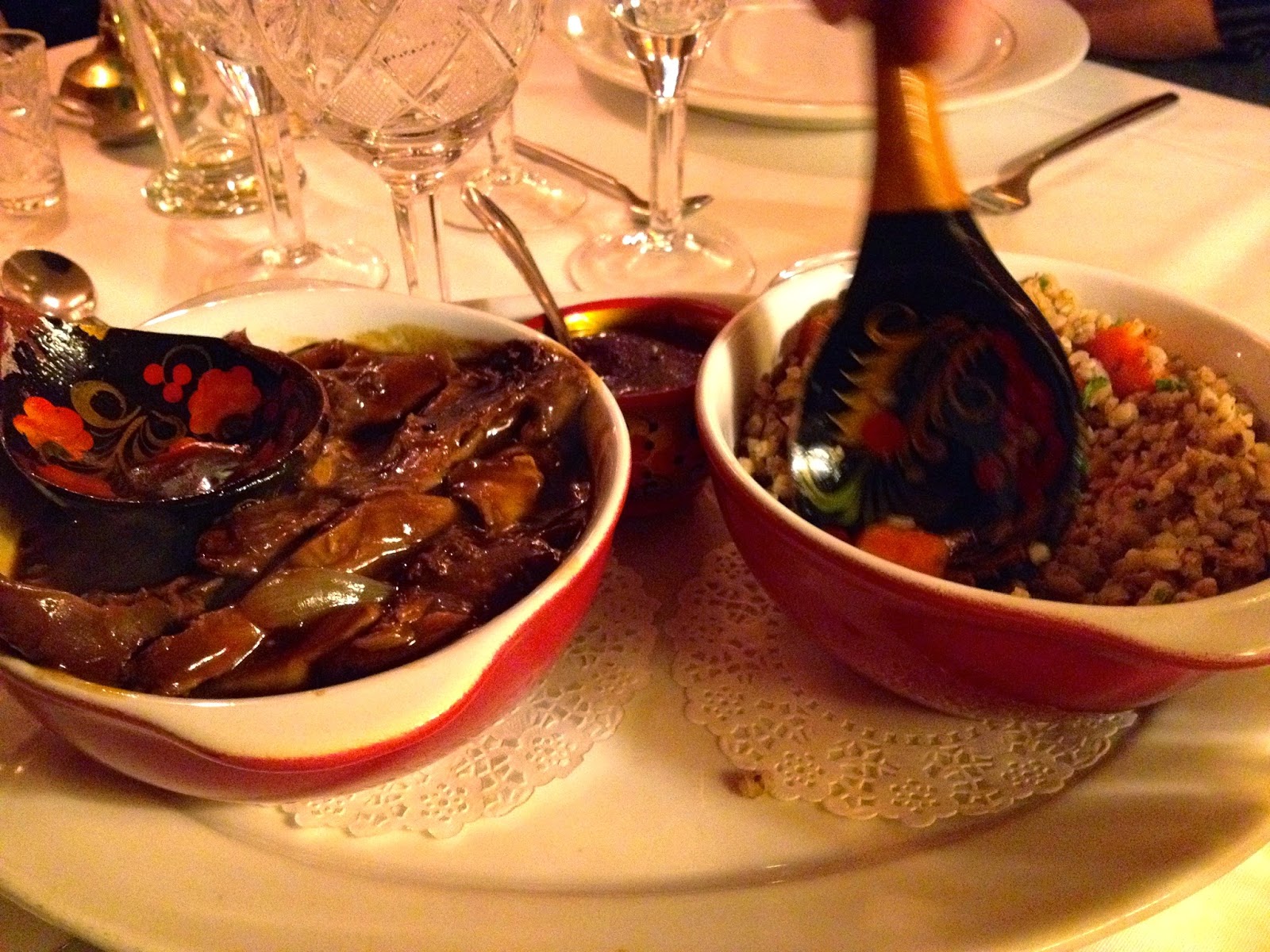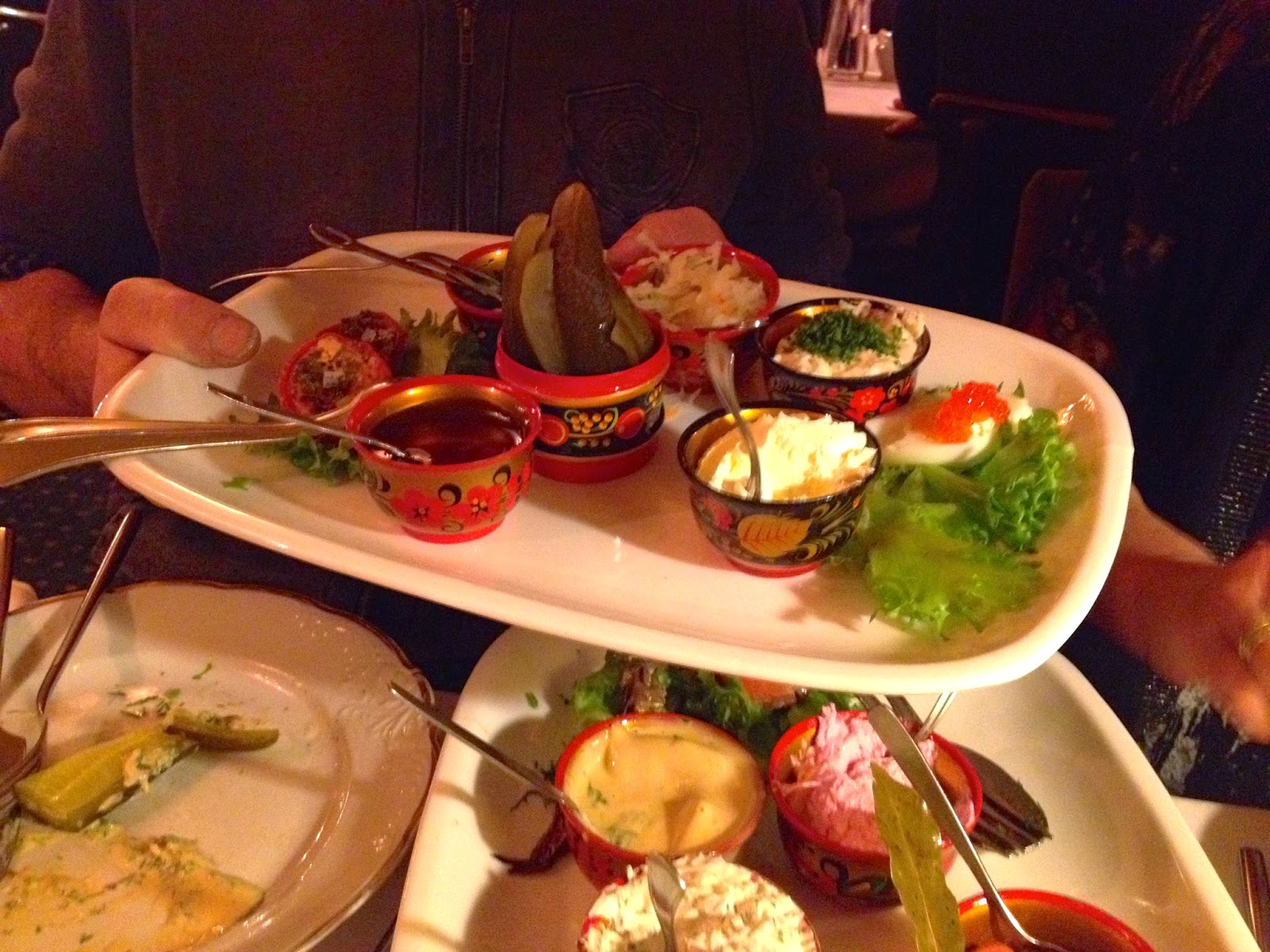De andre ved bordet valgte hare og okse. Til forrett ble det sibirsk pelmeni, russiske dumplings i en god suppe med kremet soppstuing til. Medspiserne valgte blini og Zakuski, russiske smaksopplevelser til sin forretter. Alt var suverent godt, og porsjonene var store. 22 euro per pers kostet Zakuskien, og du må være to for å bestille den. Mye å velge mellom, og for sildeelskere kan det anbefales.